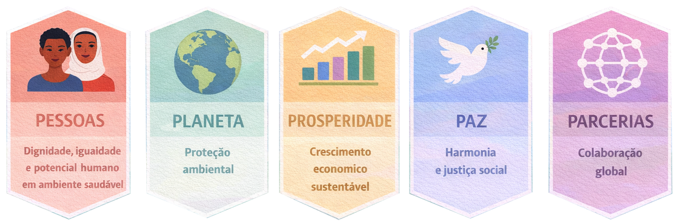 Os eixos temáticos da Agenda 2030, frequentemente referidos como os "5 Ps" (ou 5 dimensões).
